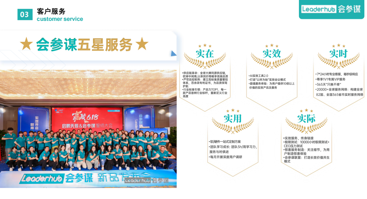 会参谋以行业服务破局者之姿,精确瞄准企业会议效率痛点,每年5月份启动"五星实效月"专项行动,以创新迭代的"五星实效服务3.0"体系进行创新变革。通过“实在、实效、实时、实用、实际”五大核心维度,建立分钟级服务响应机制、AI功能提效、开通VIP客户专属服务通道等十几项硬核举措,重构智能会议服务价值链条。会参谋以五星级服务标准重塑会议服务,贯穿会前设备智联、会中协同管控、会后效能分析的完整闭环,真正实现智能、互联、实效的智慧办公新业态。