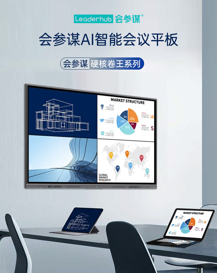 在工业设计与实用主义的深度融合上,会参谋硬核卷王系列实现全场景适配升级—— 提供 65"/75"/86"黄金尺寸矩阵,满足不同需求的办公场景;超薄机身和极简线条,让会参谋系列完美适配运用于中小型会议室及分布式办公场景。超薄金属机身搭配跑车级喷砂工艺,极简流线型边框与高端办公环境浑然一体,更通过「微边框视觉革命」将屏占比提升至 89%(较传统机型增加 15%),配合 178° 广视角防眩光屏,无论主会场 C 位还是会议室角落,画面细节始终分毫毕现。
